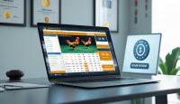 Seorang profesional menggunakan laptop di meja kerja yang rapi dengan tampilan situs taruhan sabung ayam online terpercaya.