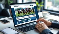 Seseorang menggunakan laptop untuk bertaruh pacuan kuda online dengan latar belakang meja kerja yang rapi.
